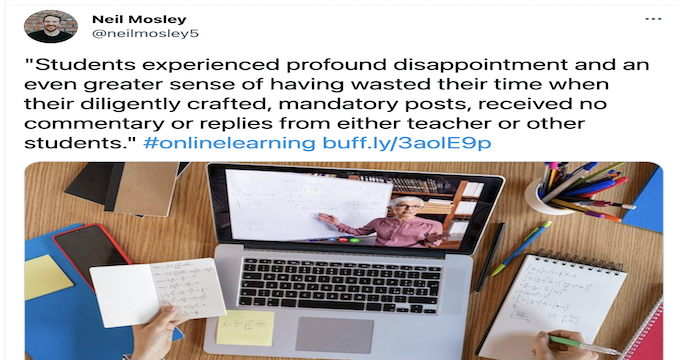 A key point I agreed with the authors on is “Discussion forum participation shouldn’t be busy work…”. For four seven long years I answered every question in the course notes and the discussion forms. However, in all that time there were ever only a handful of responses. I kept answering these questions because they were useful for my learning, but it was intensely frustrating that I was the only one who seemed to take it seriously.